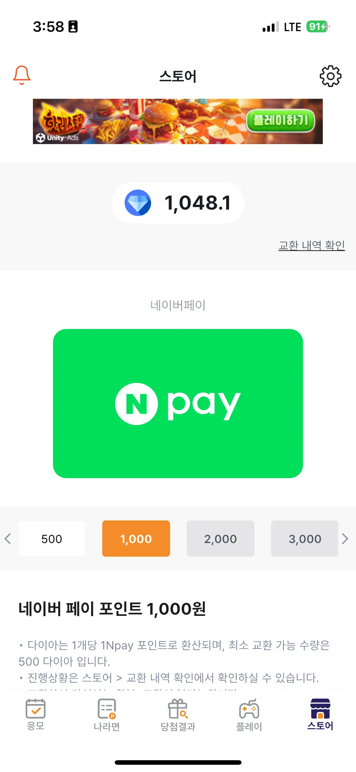 스토어 탭에서 원하는 단위를 선택한 뒤 네이버페이로 바꿀 수 있어요. 최소 500다이아부터 교환 가능해요.