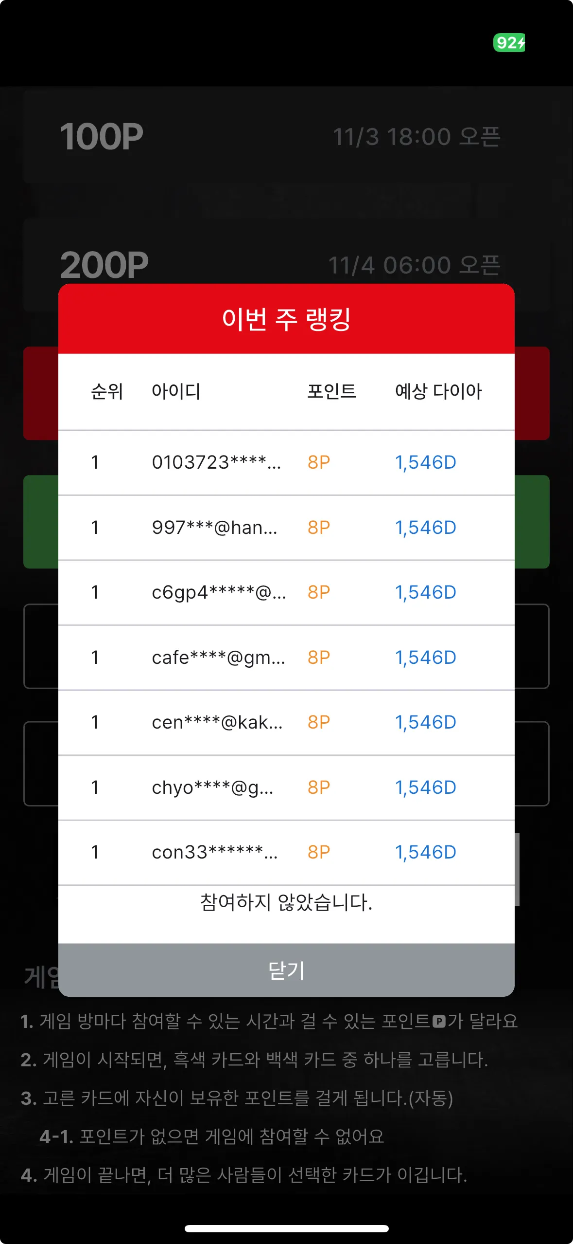 흑백 마피아 게임에 참여하면, 주간 랭킹 순위에 따라 매주 월요일 다이아를 드려요.