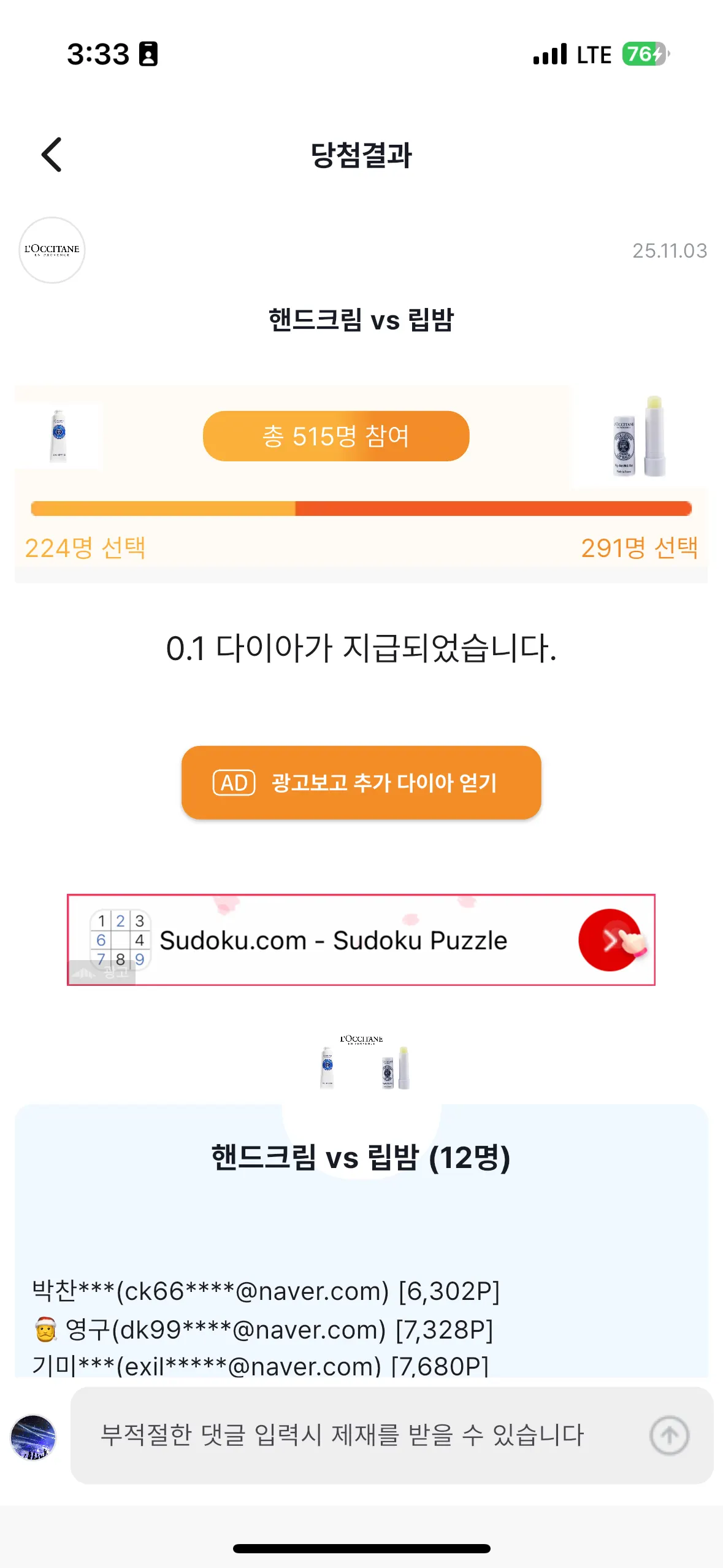 미당첨 캠페인 당첨결과 화면에서 [광고보고 다이아 획득] 버튼을 눌러보세요.