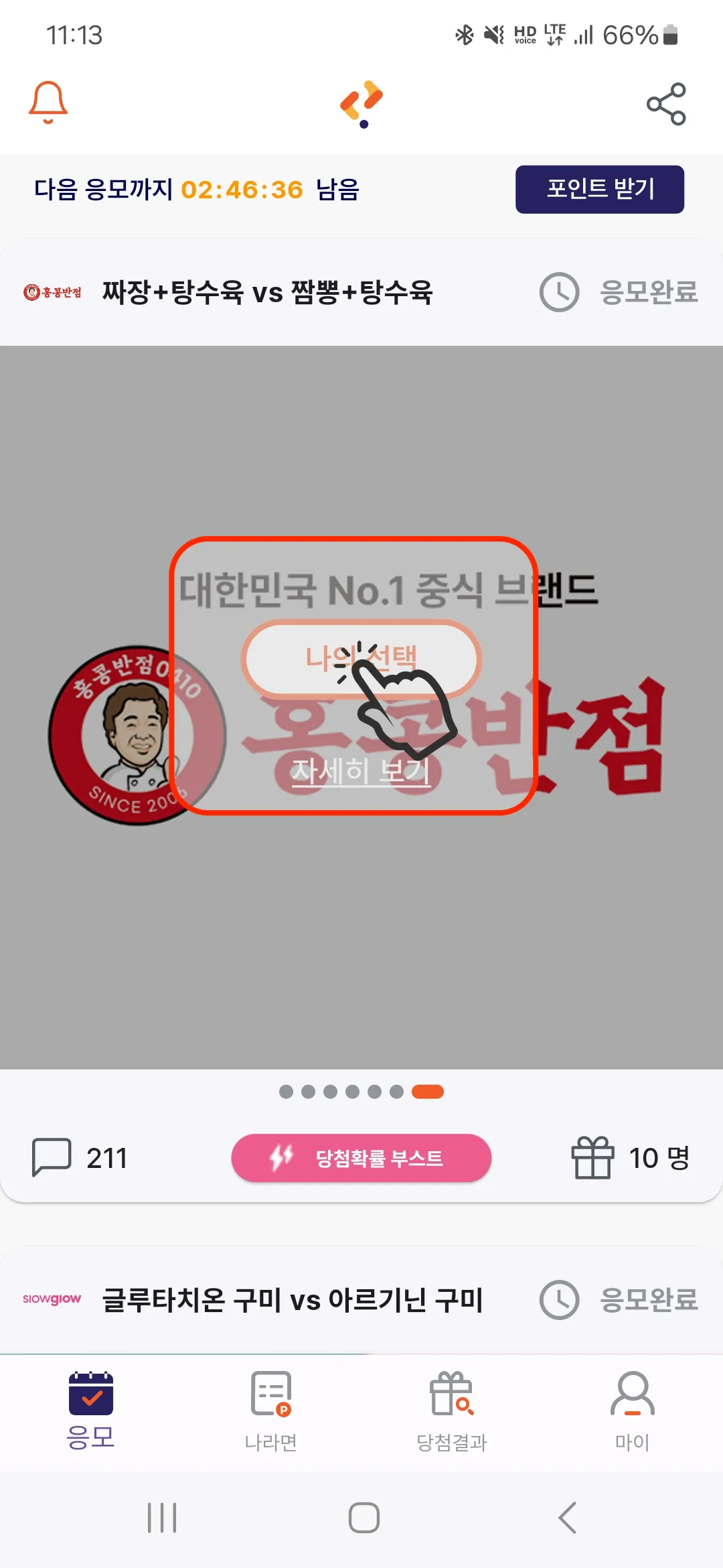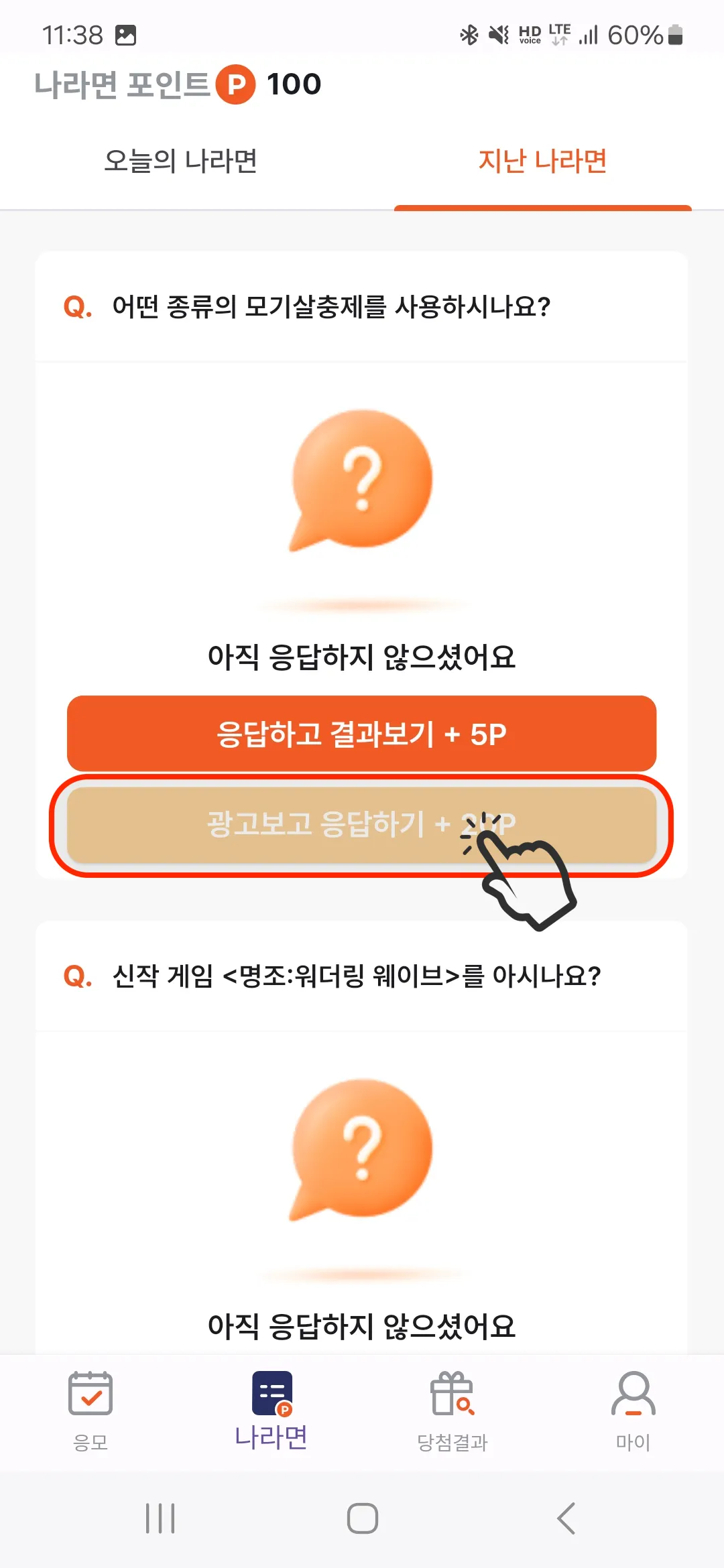 <지난 나라면> 에서 광고보고 응답하여 추가적인 응모 포인트를 획득할 수 있습니다.